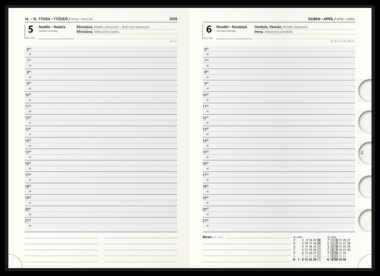 Originální denní diář s přírodním motivem dřeva a ražbou je vyráběný z jemně strukturovaného materiálu s efektním výsekem uvnitř. Má velký prostor pro poznámky a plánování. Výjimečností tohoto diáře je, že soboty i neděle jsou na každé stránce zvlášť. jemně strukturovaný materiál, ražba motivu a roku, šitá vazba V8, kapitálky, stužka, perforované rožky, ofset, 70g/m2, krémový papír, indexové výseky