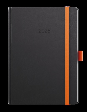 Neobyčejný denní diář s matným povrchem ze strukturovaného materiálu s oranžovou gumičkou a poutkem. Je vyráběný ve formátu A5, má velký prostor pro poznámky a plánování. pololesklý, jemně strukturovaný materiál, ražba roku, gumička a poutko, stužka, kapitálky, perforované rožky, mapa ČR a SR, vlepená kapsa, kulaté rohy
