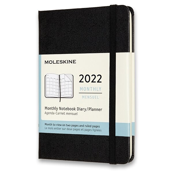 Měsíční diář kapesní velikosti na rok 2022. Měsíc je zobrazen na dvou stránkách, po kterých následují dvě linkované stránky. Na konci je 51 linkovaných stránek na poznámky. Diář má pevnou, ve hřbetu šitou vazbu. Obepíná ho pružná páska proti samovolnému otevírání. Obsahuje praktickou vnitřní kapsu, textilní záložku, 295 barevných samolepek a leták s historií Moleskine. Papír s gramáží 70 g/m2, neobsahuje kyseliny. Rozměr: 9 x 14 cm, 64 listů Diář je v anglickém jazyce.