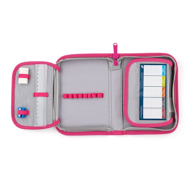 Pełny tekst →Jednopoziomowy piórnik szkolny z 2 klapkami, pusty, zawiera 25 gumowych szlufek do przechowywania artykułów piśmiennych.