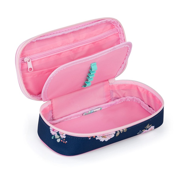 Etui szkolne Etue jest wyposażone w mocne zamki błyskawiczne, kieszeń zapinaną na zamek oraz klapę z mocnymi szlufkami po obu stronach.