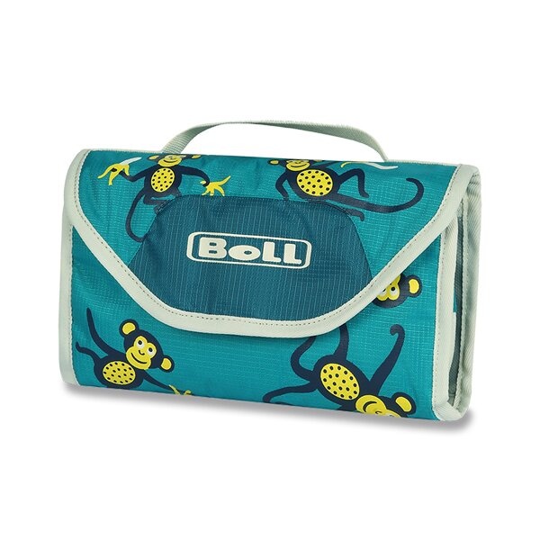Turkusowa kosmetyczka dziecięca Boll posiada 3 praktyczne kieszonki i pętelkę do zawieszenia z motywem małpki.