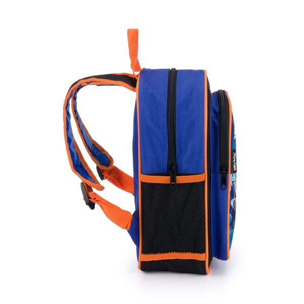 Posiada jedną dużą kieszeń, mniejszą kieszeń na przekąski i boczne kieszenie na butelkę do picia.