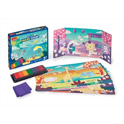 Dzięki 7 kolorom tuszu dzieci mogą malować opuszkami palców i ożywiać ilustrowane karty z kolorowymi zwierzątkami. Tworzenie jest intuicyjne i rozwija motorykę małą, kreatywność oraz koordynację ręka–oko.