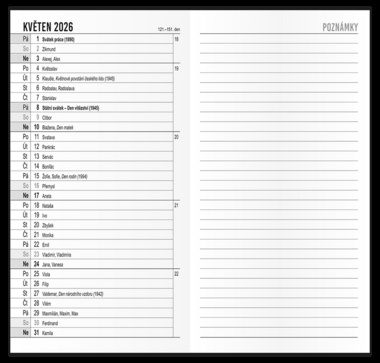 Měsíční diář v jednoduché měkké vazbě V1 v oblíbeném formátu a s moderním motivem. tištěná grafika potažená matným laminem, šitá vazba v1, ofset, 70g/m2