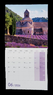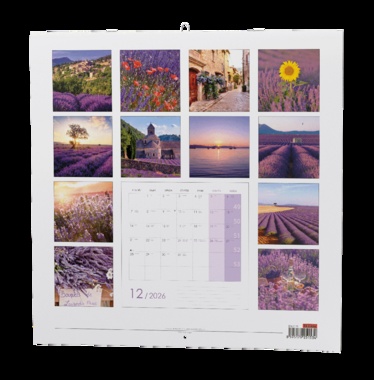 Nástěnný kalendář s měsíčním kalendáriem, v moderním formátu LP desky ve stylu Provence. Papír: křída mat 135 g/m2 Obálka: křída mat 150 g/m2 Vazba V1 na 2 skoby + háček, uvnitř kartonová vložka pro zpevnění, baleno po 1 ks ve folii