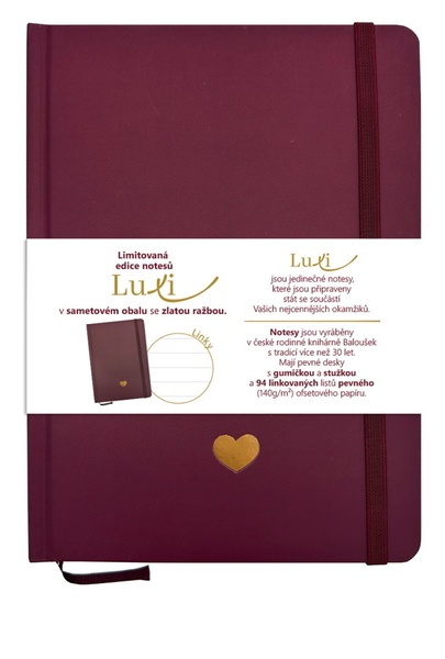 Pełny tekst →Limitovaná edice linkovaných notesů Luxi se sametovým přebalem v moderní bordó barvě a se zlatým motivem srdce. Elegantní notes se stuhou a gumičkou je ideální…