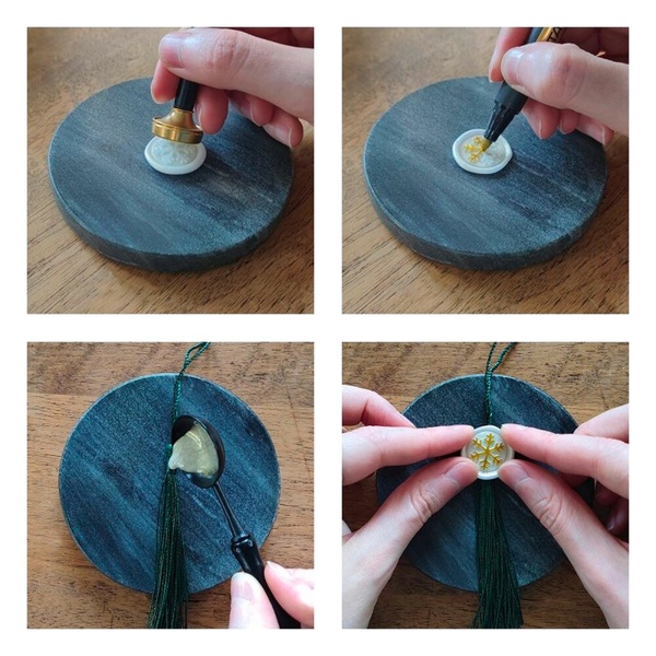 Stojánek se lžičkou se umístí nad zapálenou čajovou svíčku. Do lžičky se vloží 3–4 granule vosku – kombinací různých barev lze vytvořit mramorovaný efekt. Po roztavení se vosk nalije na požadované místo a vtiskne se do něj kovové pečetidlo. Po zchladnutí je pečeť hotová.
