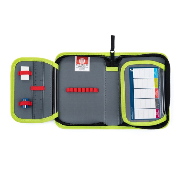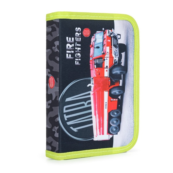 Pełny tekst →Jednopoziomowy piórnik szkolny z 2 klapkami, pusty, zawiera 25 gumowych szlufek do przechowywania artykułów piśmiennych.