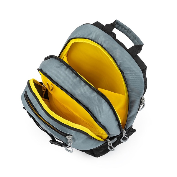 Plecak składa się z dwóch głównych przegród i jednej mniejszej kieszeni przedniej wyposażonej w mocne zamki i praktyczne szlufki.