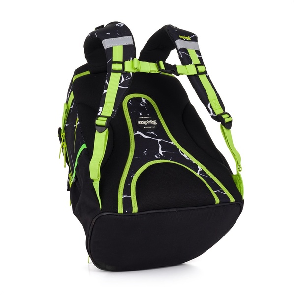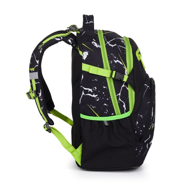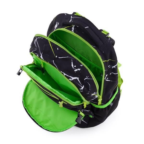 Plecak ma solidne dno, które zapobiega przewracaniu się i umożliwia stabilne stanie. Posiada dwie pojemne komory na wszystkie przybory szkolne, boczne elastyczne kieszenie nadają się na butelkę z napojem, a przednia kieszeń służy na przykład do przechowywania przekąski.