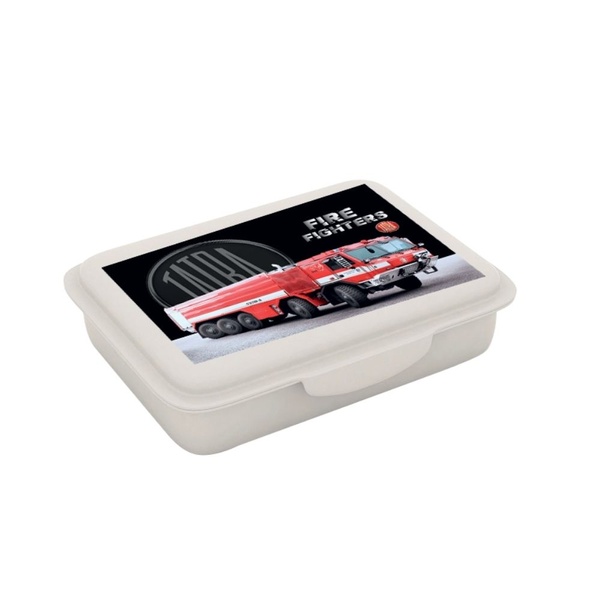 Pełny tekst →Plastikowe pudełko na przekąski z motywem wozu strażackiego.