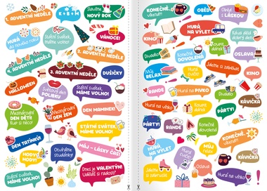 8 tematických stran samolepek: dny a měsíce, číselníky, ikonky pro události, checklisty a „to-do“ políčka, habit & mood trackery, vlaječky, rámečky a motivační citáty.