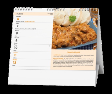 Stolní kalendář s týdenním kalendáriem a s recepty na tradiční české pokrmy. Papír: G print, 100 g/m2 Obálka: křída lesk 135 g/m2 Stojánek je z kvalitní bílé lepenky 600g/m2 Dělená kovová spirála "twin wire"
