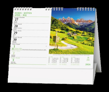 Stolní kalendář s týdenním kalendáriem s obrázky přírodních scenérií. Papír: G print, 100 g/m2 Obálka: křída lesk 135 g/m2 Stojánek je z kvalitní bílé lepenky 600g/m2 Dělená kovová spirála "twin wire"