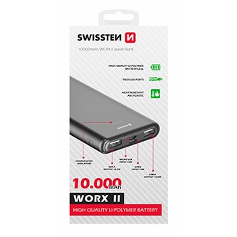 Opis produktu Powerbank SWISSTEN WORKS II 10000mAh z wejściami USB-C i Micro USB oraz dwoma wyjściami USB-A o łącznej mocy 10,5W.