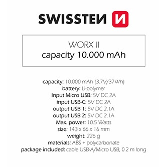 Dzięki temu tylko od Ciebie zależy, którego kabla użyjesz do naładowania powerbanku. Ponadto ten power bank SWISSTEN WORX II 10000mAh posiada dwa porty USB-A o łącznej mocy 10,5W.