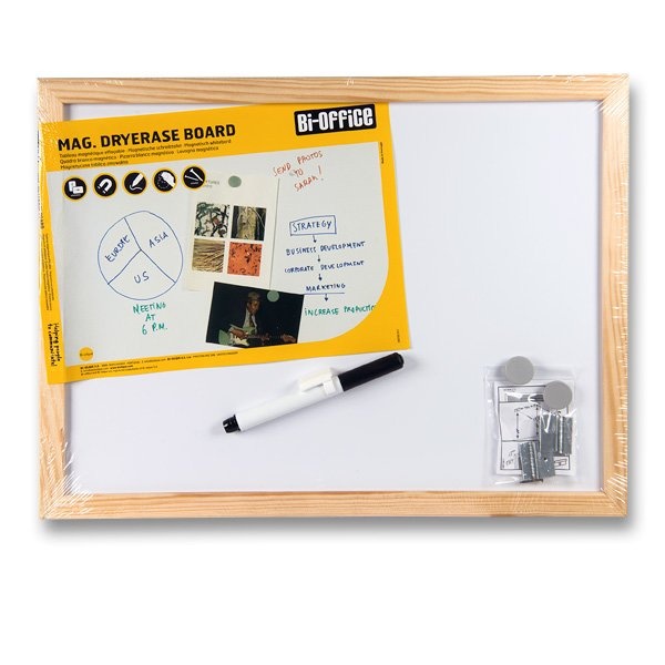 Biała tablica magnetyczna w drewnianej ramie, zawiera haczyki do zawieszania, 2 magnesy i czarny marker do tablicy magnetycznej.