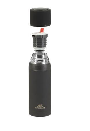 „Termos podróżny do przechowywania gorącego lub zimnego napoju o pojemności 500 ml. Cechy: podwójne ściany; gumowane dno; przycisk odblokowania/zablokowania; utrzymywanie napoju w cieple do 8 godzin; utrzymywanie zimnego napoju do 24 godzin; Pojemność: 50