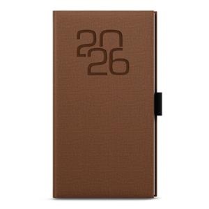 Kapesní týdenní diář z příjemného materiálu v hnědé barvě a s moderní ražbou roku. Trendy a praktický doplněk do každé kapsy. Diář má velký prostor pro poznámky a plánování. strukturovaný materiál, šitá vazba V8, ražba roku, poutko na tužku, stužka, perforované rožky, ofset, 70g/m2