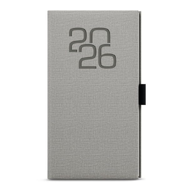 Kapesní týdenní diář z příjemného materiálu v šedé barvě a s moderní ražbou roku. Trendy a praktický doplněk do každé kapsy. Diář má velký prostor pro poznámky a plánování. strukturovaný materiál, šitá vazba V8, ražba roku, poutko na tužku, stužka, perforované rožky, ofset, 70g/m2