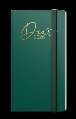 Kapesní týdenní diář v tmavě zelené barvě a luxusní zlatou ražbou je malý pomocník pro Vaše plánování. pololesklý, jemně strukturovaný materiál, ražba roku přes stříbrnou pásku, šitá vazba V8, stužka, perforované rožky, ofset, 70g/m2
