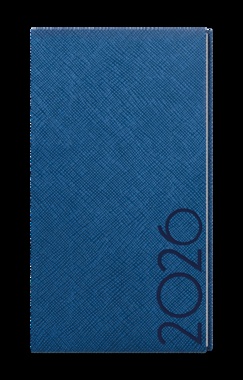 Kapesní týdenní diář v modré barvě se strukturovaným povrchem. Moderní doplněk do každé kapsy. Diář má velký prostor pro poznámky a plánování. strukturovaný materiál s lesklým povrchem, ražba roku, šitá vazba V8, stužka, perforované rožky, ofset, 70g/m2