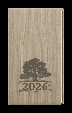 Kapesní týdenní diář s přírodním motivem dřeva s ražbou. Je vyráběný z jemně strukturovaného materiálu, má velký prostor pro poznámky a plánování. jemně strukturovaný materiál, ražba motivu a roku, šitá vazba V8, stužka, perforované rožky, ofset, 70g/m2, krémový papír