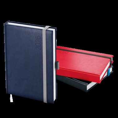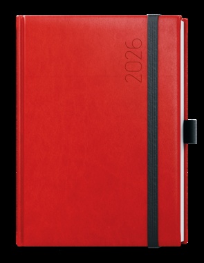 Týdenní diář v červené barvě z jemné vivelly ve formátu A5 s praktickou gumičkou a poutkem na propisku. Má velký prostor pro poznámky a plánování. jemný hladký materiál, ražba roku, jednostranná pěnová výplň desek, šitá vazba V8, stužka, kapitálky, perforované rožky, mapa ČR a SR, vlepená kapsa, gumička a poutko, ofset, 70g/m2