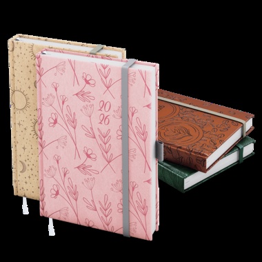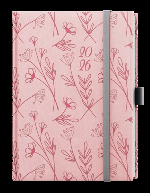 Týdenní diář v oblíbené vivelle s růžovou celoražbou motivu Kvítí. Diář v oblíbeném formátu s velkým prostorem pro poznámky a plánování. jemný hladký materiál, celoplošná ražba motivu včetně ražby roku, šitá vazba V8, stužka, gumička, poutko na propisku, perforované rožky, vlepená kapsa, ofset, 70g/m2