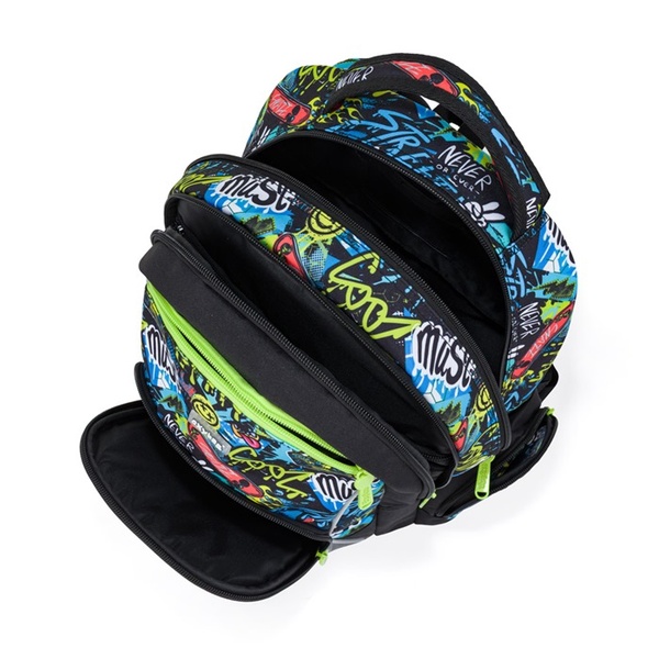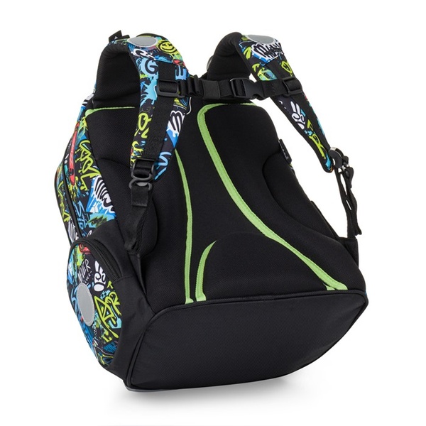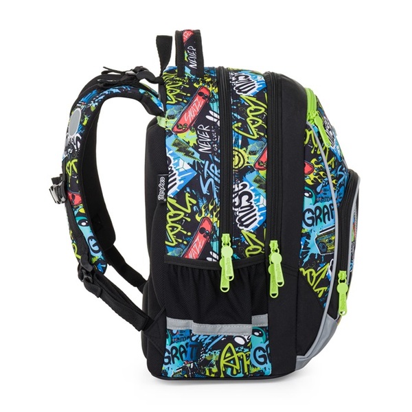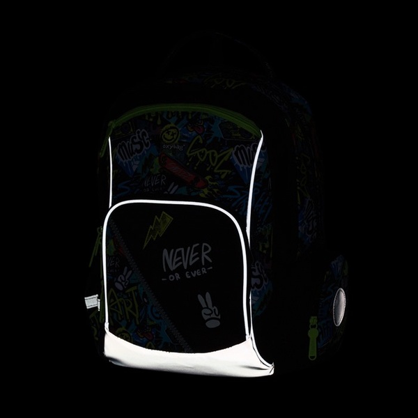 Wewnętrzne kieszenie oferują dużo miejsca na podręczniki, zeszyty i inne przybory szkolne. Solidne, wodoodporne dno chroni zawartość przed zabrudzeniem i przeciekaniem. Po bokach znajdują się dwie kieszenie – jedna zapinana na zamek i jedna otwarta, na przykład na butelkę. Elementy odblaskowe zwiększają bezpieczeństwo dziecka w drodze do szkoły.
