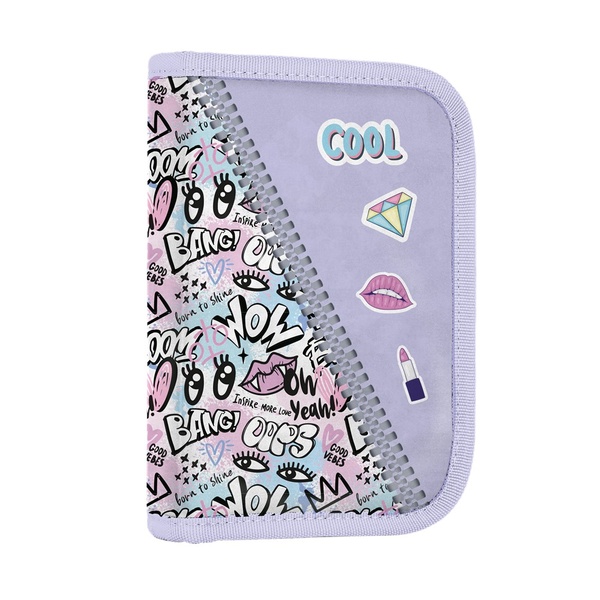 • Piórnik jednopoziomowy z dwiema klapkami – bez wypełnienia, z gumowymi szlufkami i przezroczystą folią na plan zajęć.