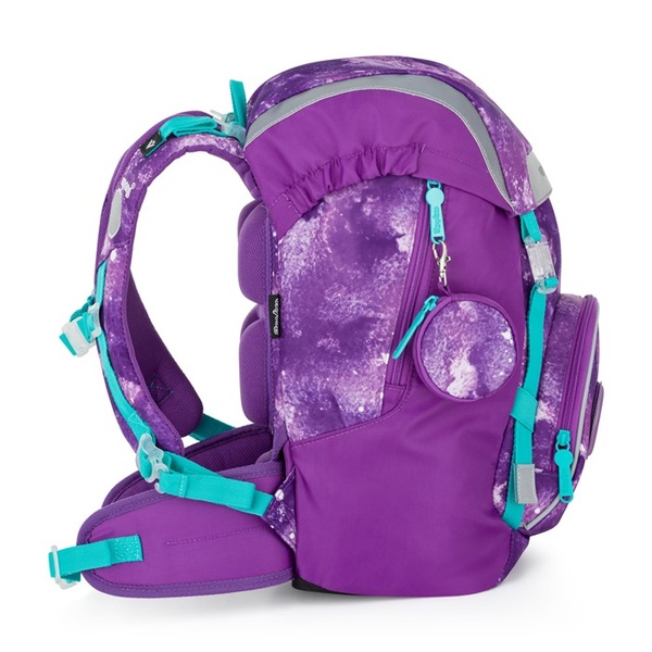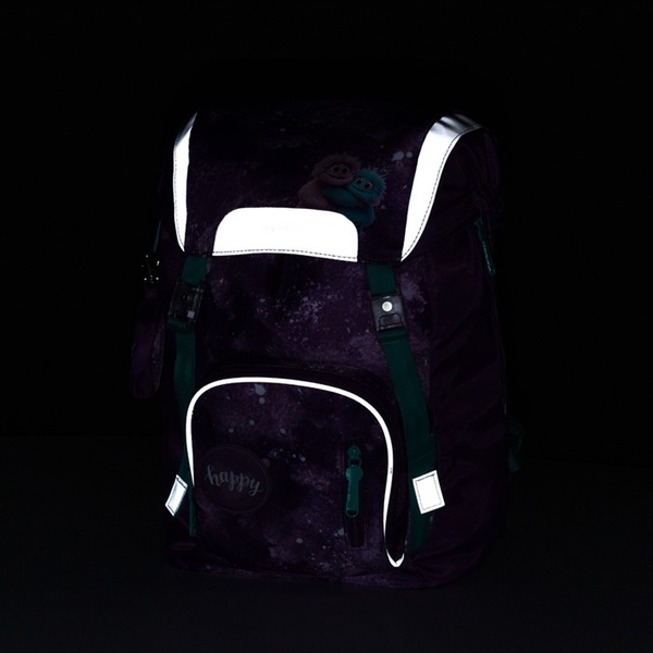 Bezpieczeństwo zwiększa wzmocnione, wodoodporne dno i liczne elementy odblaskowe. Praktyczne podwójne zapięcie magnetyczne ułatwia otwieranie, główna komora oferuje dużo miejsca i jest uzupełniona wewnętrzną przegrodą i ściągaczem. Plecak posiada boczną kieszeń na butelkę oraz przednią kieszeń na przekąskę. W zestawie znajdują się również 3 wymienne naszywki, dzięki którym dziecko może ozdobić plecak w zależności od nastroju.