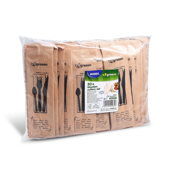 Sztućce wykonane są z nieimpregnowanego forniru drewnianego, są wytrzymałe, odporne na wysokie temperatury i nadają się do bezpośredniego kontaktu z żywnością. Serwetka jest kompostowalna i ma naturalny, ekologiczny wygląd.