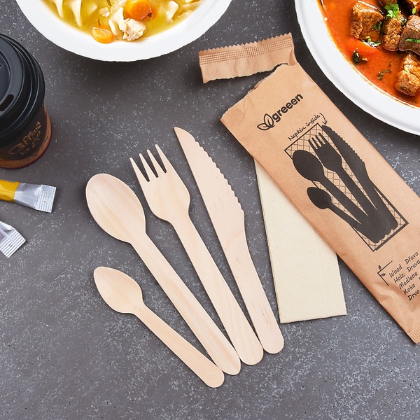 Praktyczny zestaw drewnianych sztućców z serwetką – higienicznie zapakowany, idealny na pikniki, catering, do restauracji i na przekąski w podróży. Każde opakowanie zawiera widelec, nóż, łyżkę, łyżeczkę i serwetkę papierową.