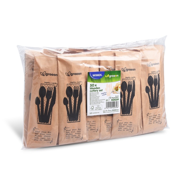Sztućce wykonane są z nieobrobionego forniru drewnianego – są wytrzymałe, odporne na wysokie temperatury i nadają się do bezpośredniego kontaktu z żywnością. Serwetka jest kompostowalna i ma naturalny, ekologiczny wygląd.